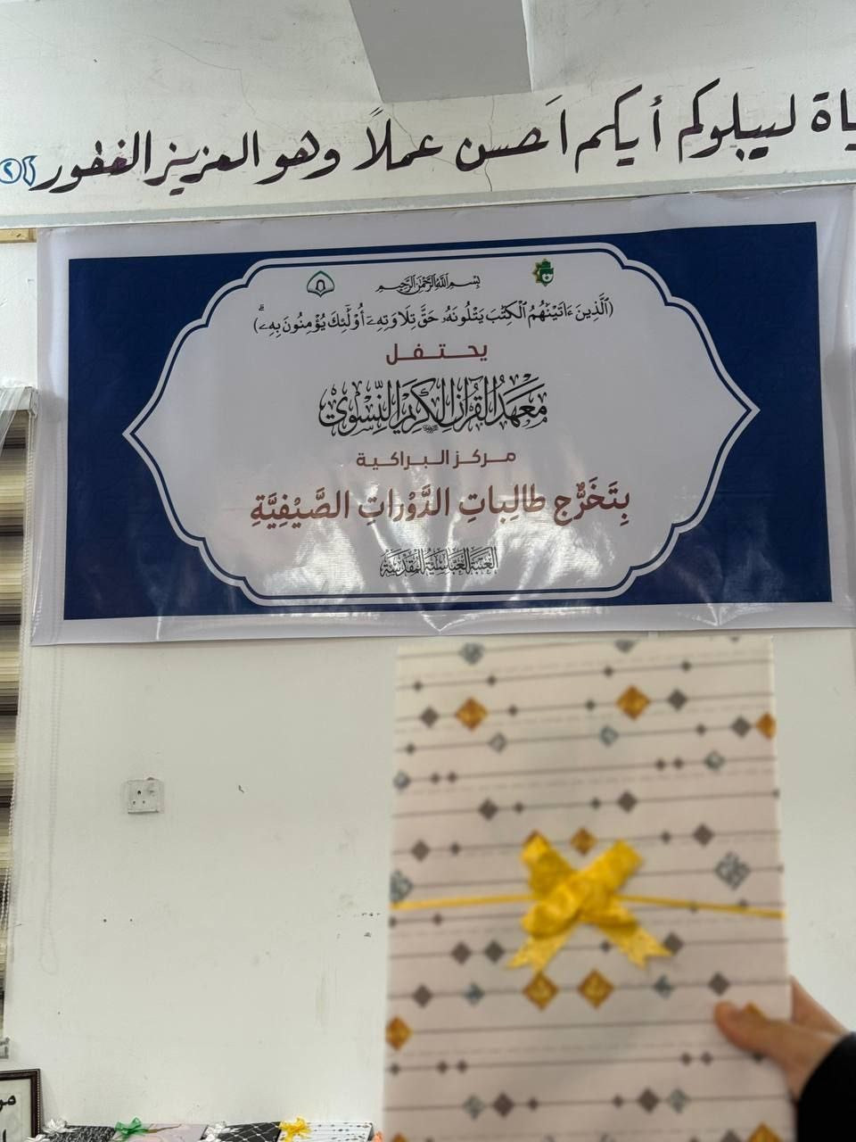 احتفى معهد القرآن الكريم التابع لمكتب المتولّي الشرعي للشؤون النسوية في العتبة العبّاسية المقدّسة في (مركز البراكية) بتخرّج (260) طالبة من طالبات البرنامج القرآني (ووجدكَ ضالًّا فهدى) للدورات الصيفية. وقالت مسؤولة المعهد السيّدة منار الجبوري: "إنّ الحفل استُهِلّ بتلاوة آيات من الذكر الحكيم بصوت الطالبة (تُقى حازم)، أعقبها إلقاء محاضرة بعنوان "الارتباط بالقرآن الكريم". وأضافت الجبوري: أنّ الفعّالية شهدت تنظيم مسابقة قرآنية جماعية عن سورة (البقرة) بين الطالبات، إلى جانب إلقاء الموشّحات الدينية بأداء فرقة الصدّيقة (عليها السلام). واختُتم الحفل بتوزيع الشهادات والهدايا على الطالبات المتخرّجات تكريمًا لجهودهنَّ في فعّاليات الدورات الصيفية القرآنية.