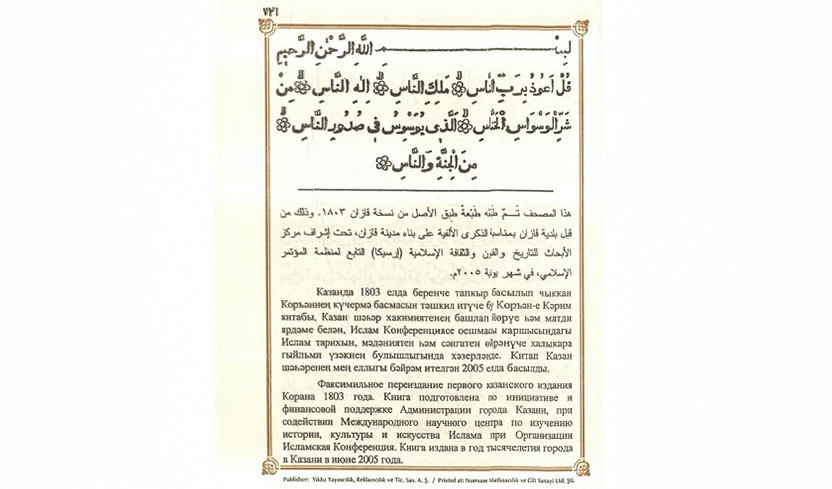 الكتاب: القرآن الكريم. مكان الطباعة: سانت بطرسبرغ ـ روسيا. عام الطباعة: (1787م). المكتبة: مكتبة جامعة بازل (Universität Basel). علامة الرف: Frey-Gryn A II 53c الرابط الدائم: https://doi.org/10.3931/e-rara-84359 بهذه المعلومات تقدم مكتبة جامعة (Universität Basel) في (سويسرا) نسخة المصحف الشريف الذي أمرت بطباعته (كاترينا) إمبراطورة (روسيا) بتمويل منها وبإشراف مفتي (قازان)؛ لذلك اشتُهر بـ(مصحف كاترينا) نسبةً إليها، ويُعد من أول المصاحف التي طُبعت في العالم. المصحف مغلف بغلاف من الجلد البني، محاط بإطارين مذهبين من أربع جهات، في بدايته صفحتان بلا رقم غلب عليهما اللون السمائي والنقوش المائية، كأنهما تهيئان القارئ للقيام برحلة روحانية مع القرآن الكريم، ثم تستقبلنا الصفحة رقم (2) حيث أحاطت سورة (الفاتحة) بمستطيل من الزخارف والورود، تحمل الطابع الروسي في الزخرفة، وقد كُتبت في الهامش معلومات عن السورة المباركة، كعدد كلماتها وأحرفها، وأسمائها الأخرى، كـ(أم الكتاب، أم القرآن، السبع المثاني) وغيرها، وحكم (البسملة)، وأحكام الآيات التالية لها، واختلاف القراءات بين (ورش) و(عاصم) وبقية القراء، وتصنيف آياتها بين المكية والمدنية، وترافق الهوامش جميع صفحات المصحف الشريف، متضمنة في بعض الصفحات أحكام التلاوة، من المدود ومقدارها، ومعاني بعض المفردات مُبينة باللغتين: العربية والفارسية، وعوضًا عن الدوائر التي تحمل أرقام الآيات، رُسمت وردة تفصل بين كل آية وأختها، وكُتب في حواشي الصفحات رقم الحزب وأجزائه، ورُقمت الصفحات بالأرقام العربية والفارسية، وخُتم المصحف الشريف بفهرسين للسور المباركة، أحدهما باللغة العربية، والآخر بالفارسية، وفهرسٍ خاص بالأجزاء باللغة العربية. وفي العام (2024م) سُلمت نسخة إلكترونية من هذا المصحف إلى (الإدارة الدينية لمسلمي روسيا الاتحادية) من قِبل إدارة (المكتبة الوطنية الروسية)؛ ليُنقل بعدها إلى مدينة (قاسموف)؛ ليُعرض خلال انعقاد المؤتمر العلمي والتطبيقي السادس الذي يأتي انعقاده في ضمن احتفالات مسلمي روسيا بذكرى مرور (1100) عام على اعتماد الإسلام دينًا رسميًا في البلاد(1). ............................ (1) موقع شفقنا عبر الرابط: https://ar.shafaqna.com/AR/313502