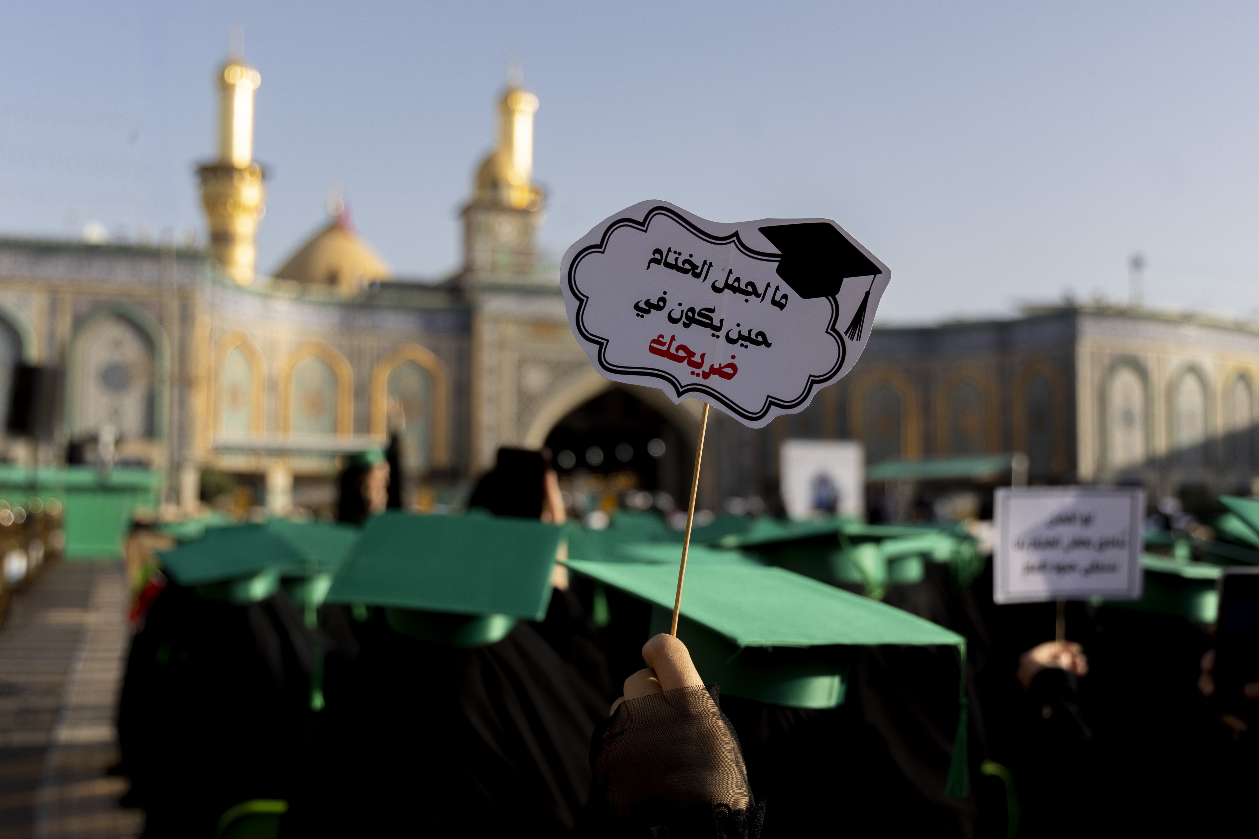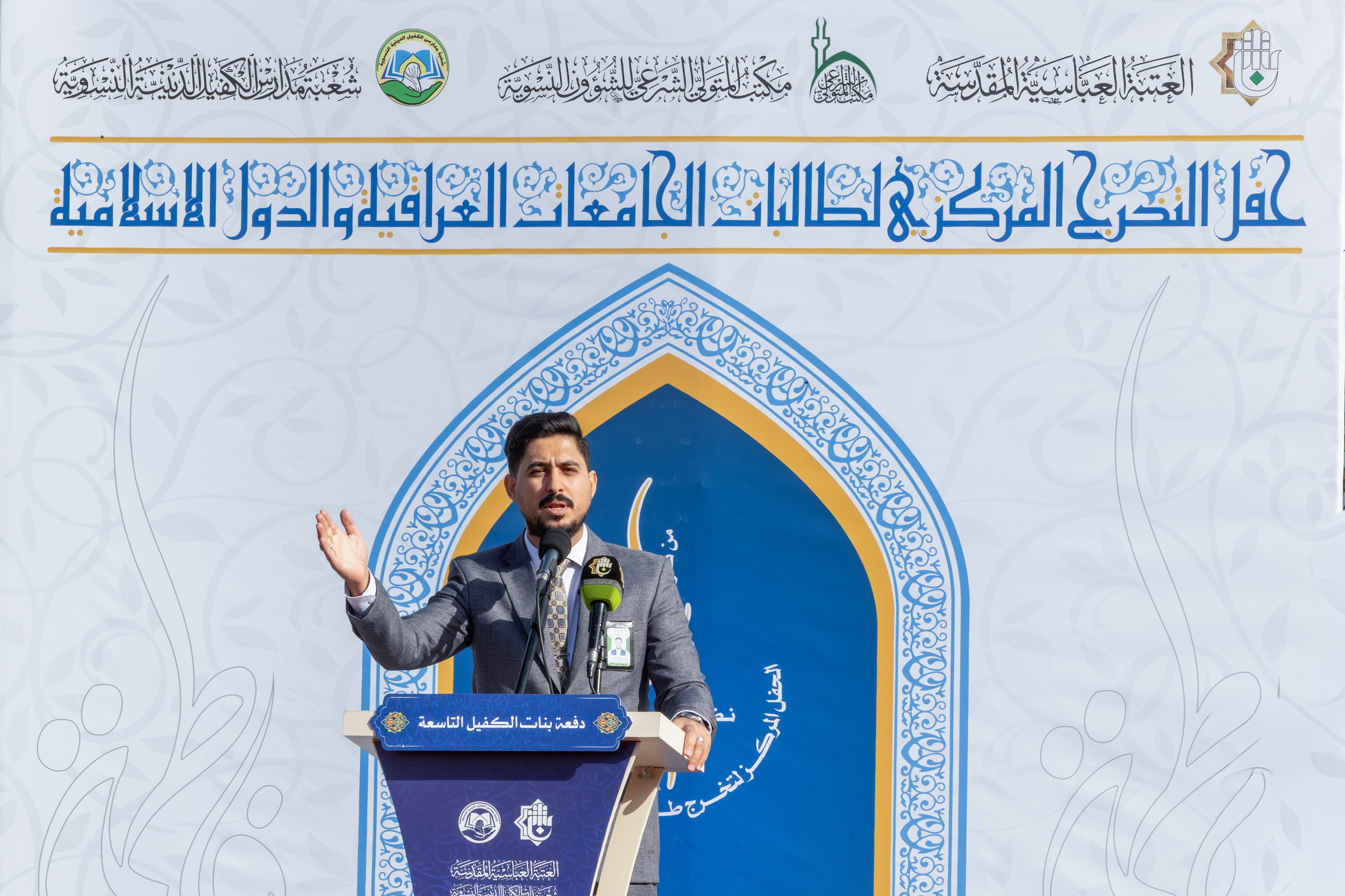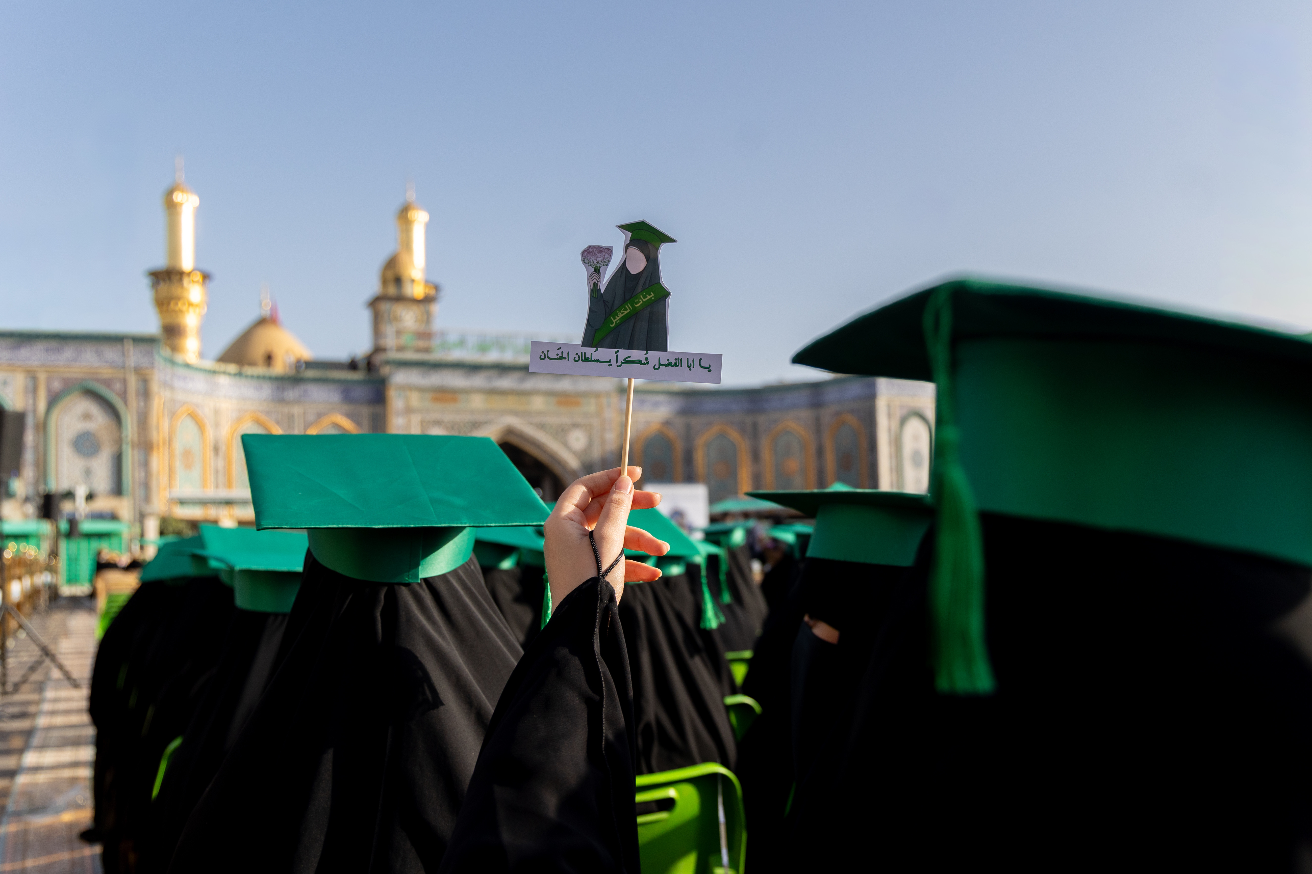 شهدت العتبة العبّاسية المقدّسة انطلاق فعّاليات حفل التخرّج المركزي لطالبات الجامعات العراقية والدول الإسلامية دفعة (بنات الكفيل التاسعة) الذي نظّمته شعبة مدارس الكفيل الدينية النسوية التابعة لمكتب المتولّي الشرعي للشؤون النسوية تحت شعار (من نور فاطمة -عليها السلام- نضيء العالم)، بمشاركة ما يقارب (5000) طالبة من مختلف الجامعات العراقية وعدد من الدول الإسلامية. قسم التخرّج وعهد الولاء: في مشهد مهيب تزيّن بالإيمان والاعتزاز الوطني، ردّدت آلاف الطالبات قَسم التخرّج وعهد الولاء للوطن وخدمة أهله عند باب قبلة مرقد المولى أبي الفضل العبّاس (عليه السلام) بحضور عدد من الشخصيات الدينية والأكاديمية وممثّلي العتبة المقدّسة. وألقى نصّ العهد عضو مجلس إدارة العتبة العبّاسية المقدّسة الدكتور عبّاس الدده الموسوي الذي تضمّن عبارات الولاء للعراق وللمرجعية العليا المتمثّلة بآية الله السيّد عليّ السيستاني (دام ظلّه الوارف)، وتأكيد القَسم لله ولرسوله وأهل بيته الأطهار (عليهم صلوات الله) على أنْ تتعهّد الخرّيجة أنْ تصون الأمانة، وتقدّس العلم، وتخدم الإنسانية والمجتمع. وجاء في نصّ القسم الذي ردّدته الطالبات: "أقسم بالله العليّ العظيم أنْ أراقب الله في مهنتي، وأكون من وسائل رحمته، وأنْ أخدم بلدي، وأقدّس حياة الإنسان، وأثابر في طلب العلم وأسخّره لنفع البشرية، وأكون صادقة في سرّي وعلانيتي، والله على ما أقول شهيد". رمزية العباءة وهوية المرأة المسلمة: جسّدت الطالبات المشاركات رسمة رمزية فريدة للعباءة وذلك بطريقة الجلوس عند باب قبلة المرقد الطاهر، ليشكّلنَ لوحة كُتب عليها "نور وعفّة" في تعبير فنّي عن هوية المرأة المسلمة المحتشمة ودورها في صون القيم الأصيلة. وقال الأمين العام للعتبة العبّاسية المقدّسة السيّد مصطفى مرتضى آل ضياء الدين: "العباءة التي شكّلتها الطالبات تمثّل رمز العفّة والهوية الإسلامية، وهي عنوان الحياء والكرامة، وتعبير عن انتمائنا الثقافي والديني الراسخ". وأضاف: أنّ هذا المشهد يجسّد التزام المرأة المسلمة بحجابها الحقيقي الذي لا يُقصد به الزينة، بل الستر والوقار، مؤكّدًا أنّ العتبة تسعى عن طريق هذا الحفل إلى تعزيز الانتماء والاعتزاز بالهوية الإسلامية الأصيلة. مراسم الزيارة والمسيرة الإيمانية: أدّت الطالبات المشاركات مراسم زيارة المولى أبي الفضل العبّاس (عليه السلام)، أعقبتها مسيرة جماعية انطلقت من منطقة باب قبلة المرقد الطاهر مرورًا بمنطقة بين الحرمين الشريفين وسط تنظيم دقيق وخطّة لوجستية محكمة أعدّتها ملاكات العتبة. انطباعات المشاركات وذويهنَّ: أجمعت الخرّيجات المشاركات على أنّ الحفل كان تجربة تربوية روحية فريدة، وقالت الطالبة زهراء حامد من محافظة صلاح الدين: "هذا التخرّج ليس نهاية مرحلة دراسية، بل تجربة روحية تعزّز من الثبات على القيم الإسلامية". مثلما عبّرت الطالبة تقوى العجمي من سلطنة عمان عن فخرها بالمشاركة قائلة: "تخرّجنا في رحاب المولى أبي الفضل العبّاس (عليه السلام) منحنا شعورًا بالانتماء والقداسة، فهو تخرّج على نهج السيّدتين الزهراء وزينب (عليهما السلام)". أمّا أولياء الأمور فقد أكّدوا أنّ ترديد القَسم عند المرقدين الطاهرين يرسّخ في الطالبة الشعور بالمسؤولية والأمانة، ويجعلها أكثر التزامًا بالقيم الإسلامية في حياتها العملية. وقال السيّد خالد عبد الحسين من محافظة واسط: "تأدية القَسم في حضرة المولى أبي الفضل العبّاس (عليه السلام) له معنىً خاصّ، فهو قَسم الولاء والرسالة، لا مجرّد احتفال أكاديمي".