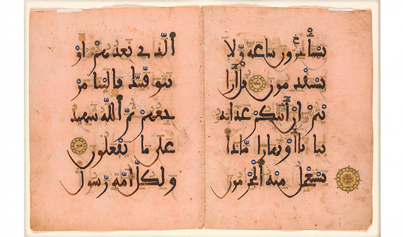 العنوان: المصحف الوردي. الموقع: الأندلس. المادة: ورق، حبر، ذهب. الأبعاد: 33.5 × 26.2 سم. رقم التصنيف: QNL:00050224. بهذه المعلومات يقدم متحف الفن الإسلامي في مدينة (الدوحة ـ قطر) صفحات نادرة من (المصحف الوردي)، وهو مخطوط قرآني أندلسي يعود إلى الحقبة الواقعة بين الأعوام (1300ـ1230 م)، ويعد أنموذجا فريدا على جماليات الخط المغربي وتطور كتابة المصاحف في الأندلس. يتميز هذا المخطوط القرآني بصفحاته وجمال تصميمه، إذ كتب على ورق وردي اللون، وهو سبب تسميته، واستخدم في كتابته الحبر البني الداكن، مع زخارف دقيقة من الذهب وألوان مائية معتمة، وتحتوي كل صفحة على (5) أسطر فقط من آيات القرآن الكريم، وقد زينت فواصل الآيات بعناية باستخدام الذهب، بينما استخدمت ألوان كالذهبي والفضي في علامات التشكيل، من الحركات والسكون والشدة، إضافة إلى زخارف دقيقة تميز بدايات الآيات والأعشار.(1) ويظهر (المصحف الوردي) تطور الخط المغربي الذي عرف بأحرفه الكبيرة والمنحنية والمستديرة، واستخدامه المتقن لبعض علامات التشكيل لتمييز الحروف الساكنة، وقد كتب هذا المصحف في بلاد (الأندلس)، تحديدا في مدينة (غرناطة) التي كانت في ذلك الوقت مركزا لصناعة الورق المصبوغ، إذ أنشئ أول مصنع للورق في (إسبانيا)(2). ويمثل استخدام الورق الوردي المصبوغ في هذه المخطوطة ابتكارا ملحوظا في وقت كان فيه استخدام الرق لا يزال شائعا في كتابة المصاحف بـ(شبه الجزيرة الإيبيرية-إسبانيا حاليا) و(المصحف الوردي)، ليس شاهدا على تطور الخط والزخرفة الإسلامية فحسب، بل شاهدا على التحولات التقنية والفنية التي شهدتها كتابة المصاحف في المغرب الإسلامي طوال العصور الوسطى(3). ............................. (1) مقال منشور في موقع: Qatar MuseuMs. (2) المصدر نفسه، وينظر المصحف الوردي سيرة ذاتية عكسية: ص87،86،84. (3) المصحف الوردي سيرة ذاتية عكسية: ص90.