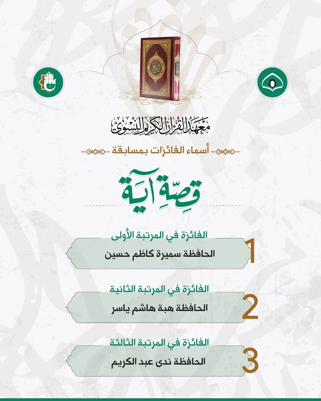 أعلن معهد القرآن الكريم النسوي التابع لمكتب المتولّي الشرعي للشؤون النسوية في العتبة العبّاسية المقدّسة عن نتائج مسابقته (قصّة آية) القرآنية السادسة. وأُطلقت المسابقة بمناسبة شهر رمضان المبارك، وتأتي في ضمن سلسلة من الأنشطة القرآنية التي يقيمها المعهد؛ لما لها من أثر في تعزيز الوعي القرآني وترسيخ مفاهيم التدبّر في آيات الذكر الحكيم. وشهدت المسابقة مشاركة (11) حافظةً للقرآن الكريم من محافظة النجف الأشرف، إذ أُجريت بشكل تحريري، وتمّ تقييم الإجابات من قِبل لجنة تحكيم متخصّصة. فازت بالمرتبة الأولى الحافظة (سميرة كاظم حسين)، وجاءت في المرتبة الثانية الحافظة (هبة هاشم ياسر)، تلتها في المرتبة الثالثة الحافظة (ندى عبد الكريم).