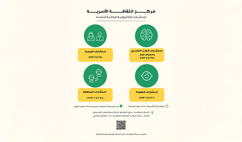 يواصل مركز الثقافة الأسرية التابع لمكتب المتولّي الشرعي للشؤون النسوية في العتبة العبّاسية المقدّسة تقديم خدمات الاستشارات الإلكترونية المجانية للنساء في المجالات النفسية والأسرية والتربوية عبر الأرقام المخصّصة لذلك: استشارات الطبّ النفسي: 07730134335 07730242940 استشارات الزوجية: 07730242910 استشارات الطفولة: 07730242960 استشارات المراهقة: 07730242950 موجودون طوال أيام الأسبوع ما عدا يوم الجمعة، من الساعة (8) صباحًا حتى الساعة (2) بعد الظهر. للمزيد من المعلومات عن مركزنا قوموا بمسح الكود: العنوان: كربلاء المقدّسة ـ حيّ الملحق، شارع مستشفى الحسيني العام ـ بناية مركز الصدّيقة الطاهرة (عليها السلام) ـ الطابق الثاني.